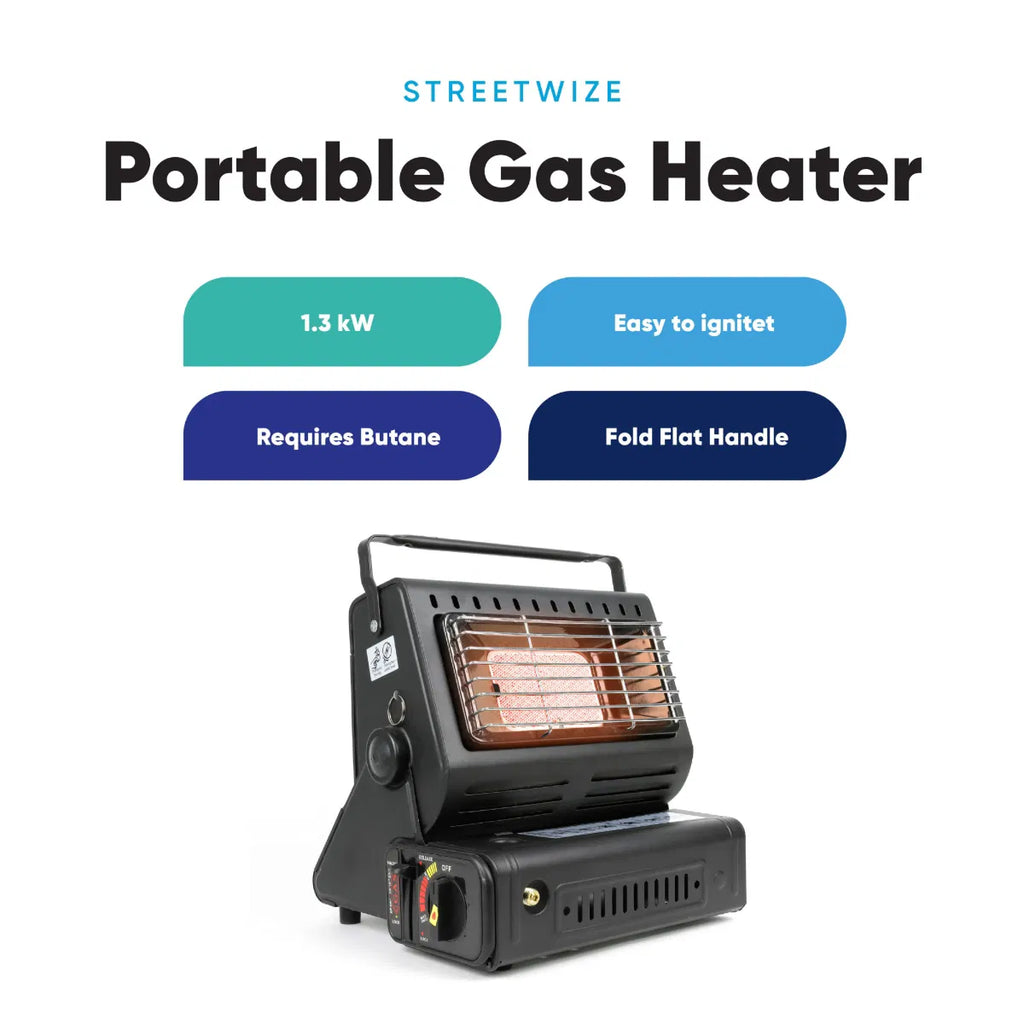 This 1.3 kW portable outdoor gas heater is ideal for use outdoors when caravanning, fishing, attending festivals, or at home in the garden, providing extra heat on cooler evenings. It is lightweight, portable, and has easy-to-use controls. The base gas heater allows you to carry it easily with the handy carry handle.