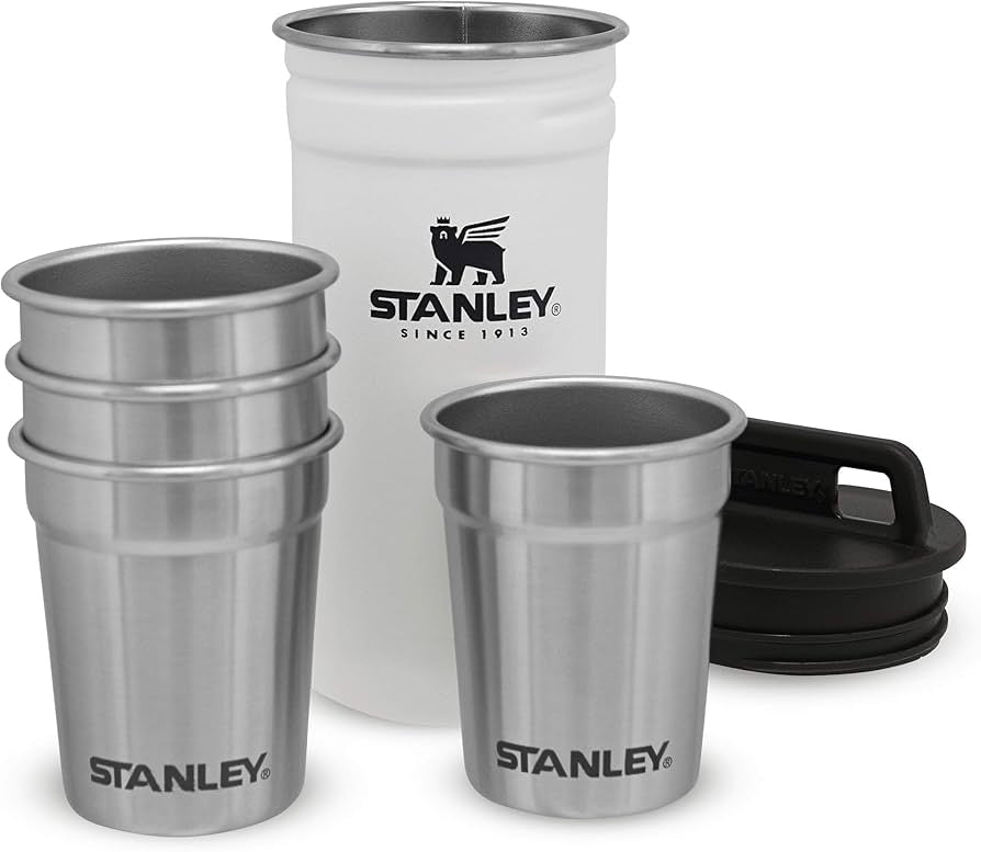 - The Stanley Adventure Shot Glass Set consists of 4 stainless steel cups (shot glasses) with a capacity of 59 ml each made of rust-proof 18/8 stainless steel, which are packaged in a shapely stainless steel container in hammer green with screw cap.